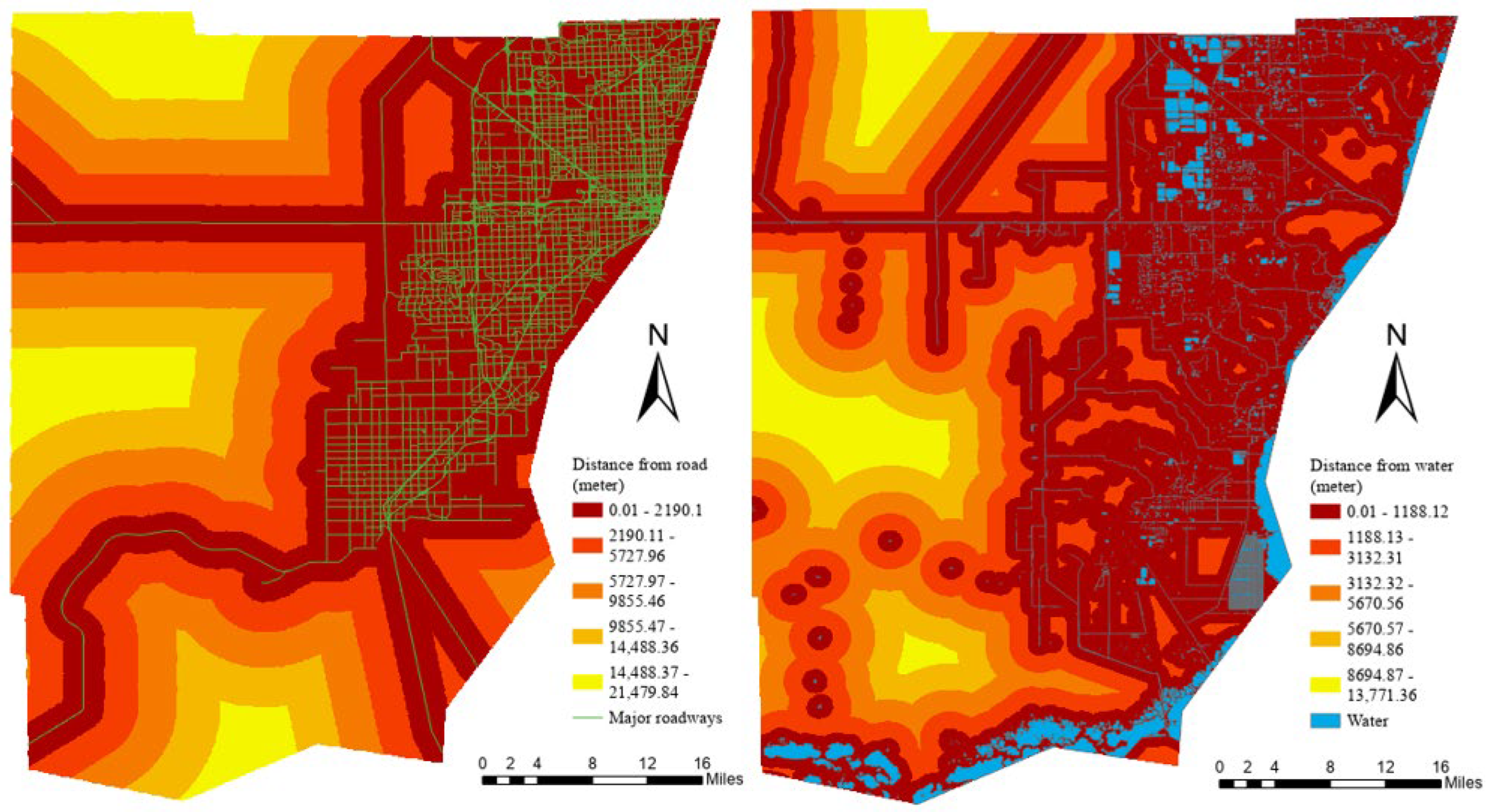 | Distance from road | The greater the impervious surface area is, the higher the risk of flooding [123,124,125]. The road network data were collected from the florida.gov website, and the road distance was also calculated using the Euclidean distance tool in ArcGIS Pro 3.5 software and classified into 5 different classes as illustrated in Figure 5. | |