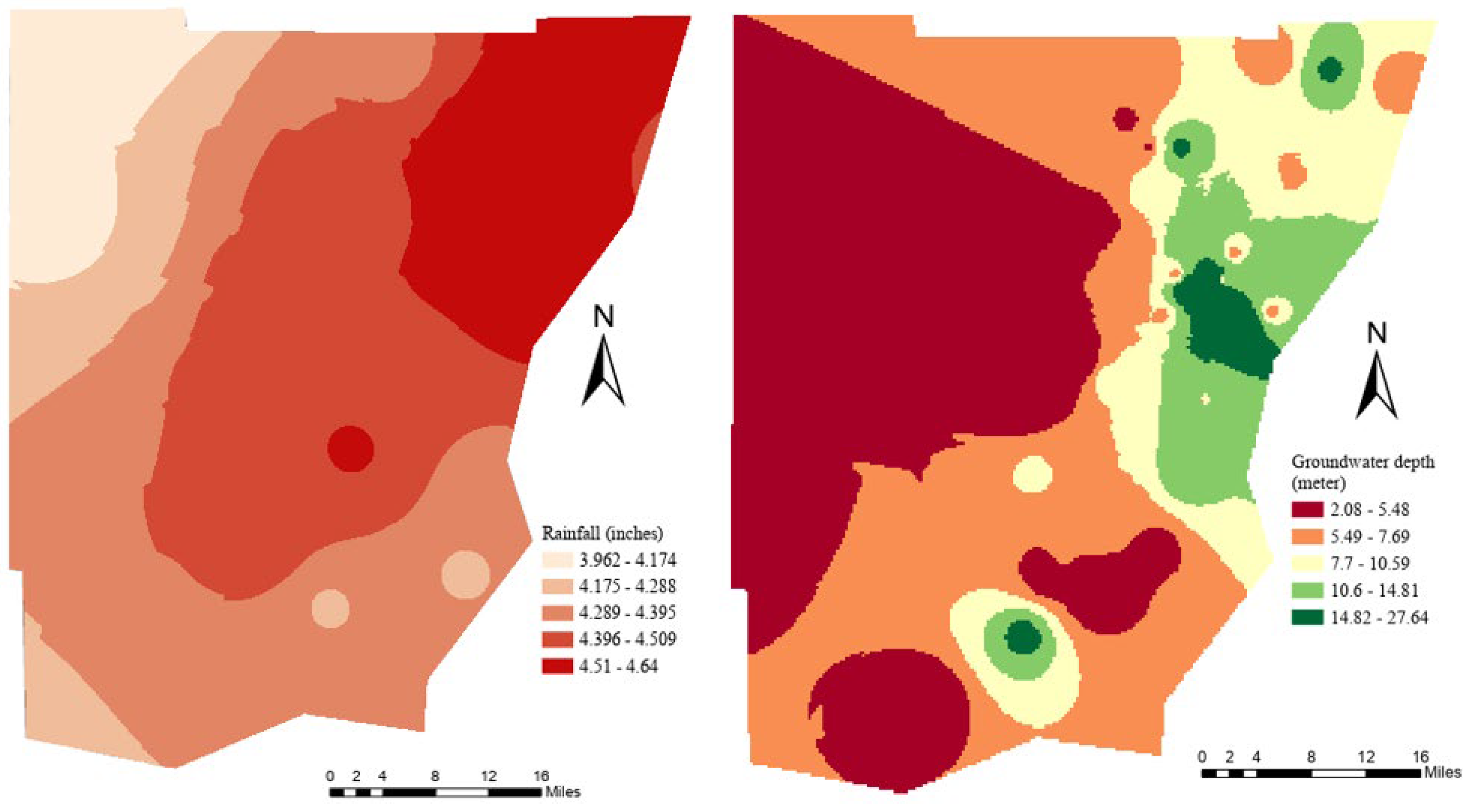 | Rainfall | Flooding in low-lying areas is mostly caused by surface runoff from extensive rainfall [129,130]. We collected rainfall data from the NOAA precipitation depth duration curve. We considered rainfall recurrence periods over 1 year-24 h for flood susceptibility mapping. The rainfall maps were prepared using the station locations and rainfall data across the study area and interpolated via the IDW interpolation method as illustrated in Figure 6. | |