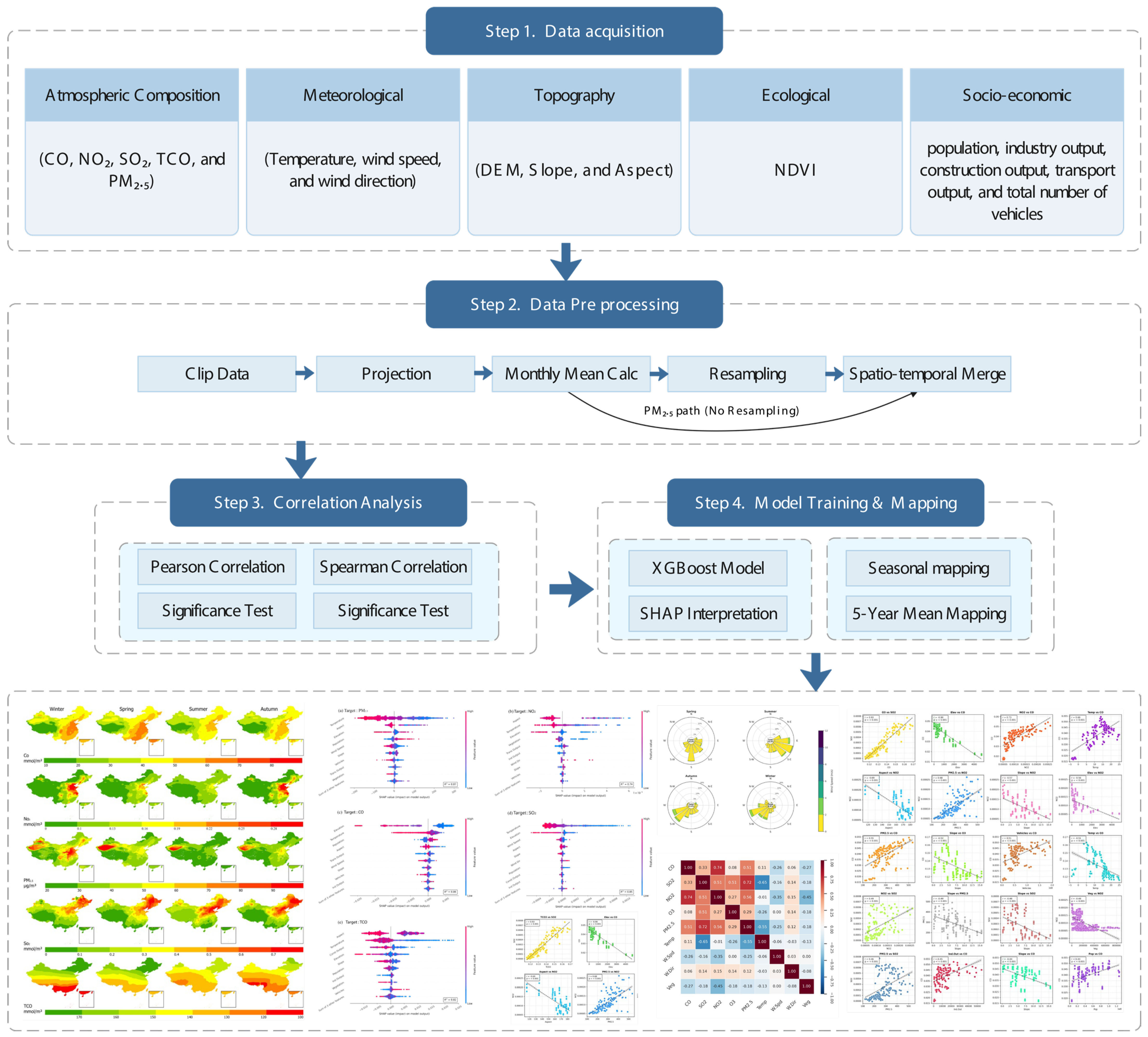 - To investigate the correlation of air pollution intensity with anthropogenic drivers, namely socio-economic activities (population, industry, transport, vehicle density, construction output) and ecological vegetation cover, employing a tiered analytical framework that contrasts linear Pearson and monotonic Spearman correlations with interpretable machine learning (XGBoost) to capture complex threshold effects missed by traditional statistical models.