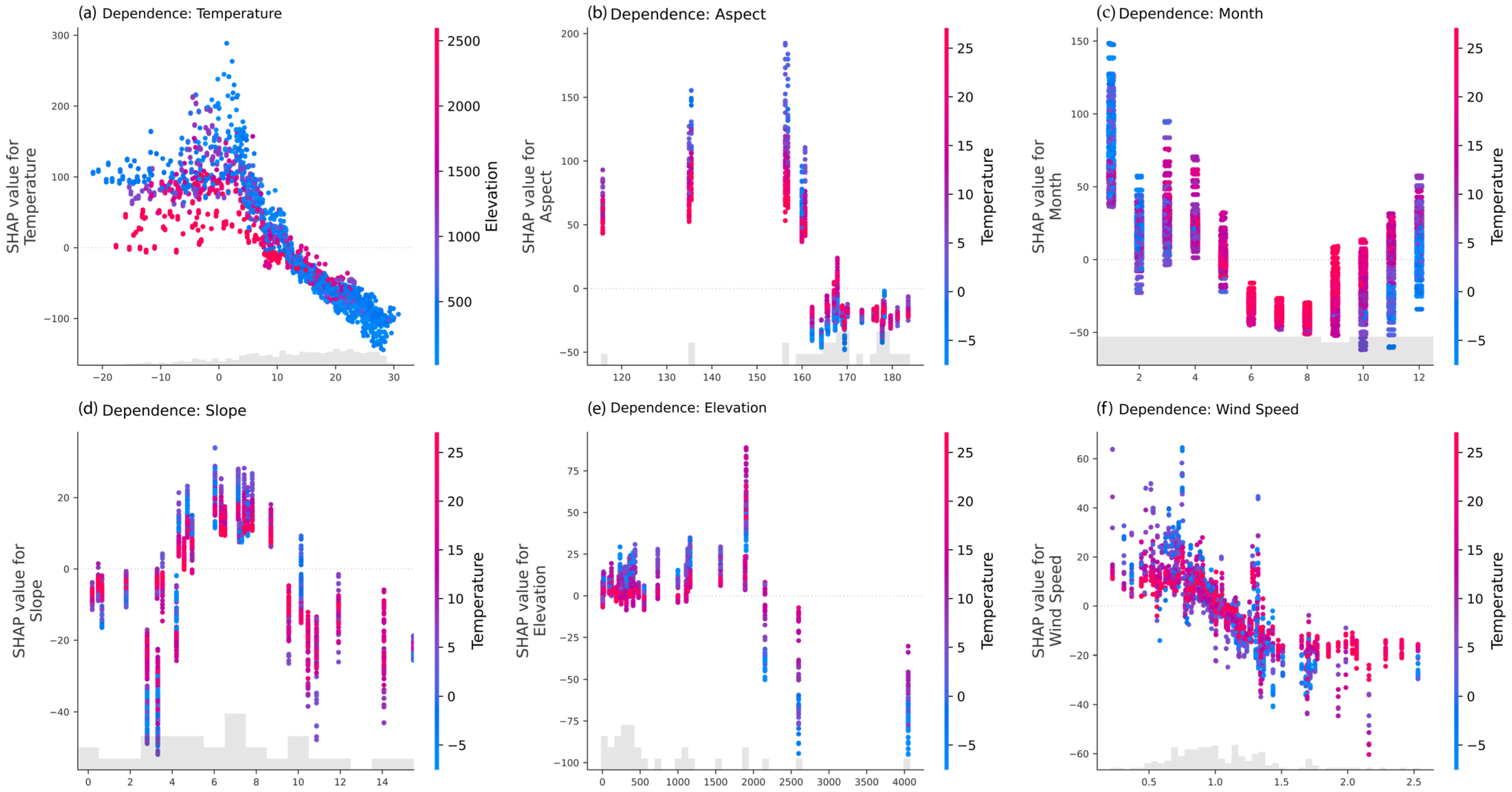 - Temperature exhibits a non-linear threshold effect: PM2.5 and SO2 increase exponentially below 0 °C. Topography strongly modulates pollution, with low-lying basins acting as pollutant traps (e.g., ρ = −0.82 between elevation and CO).