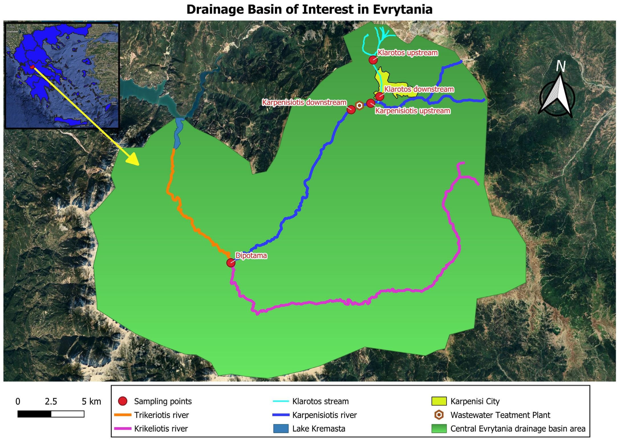 - Ministry of Environment & Energy, Special Secretariat for Water. 1st Update of River Basin Management Plans—River Basin District of Western Sterea Ellada (EL04): Summary (English), 2018. Available online: https://wfdver.ypeka.gr/wp-content/uploads/2022/01/EL04_1REV_P22b_Perilipsi_EN.pdf (accessed on 30 September 2025).