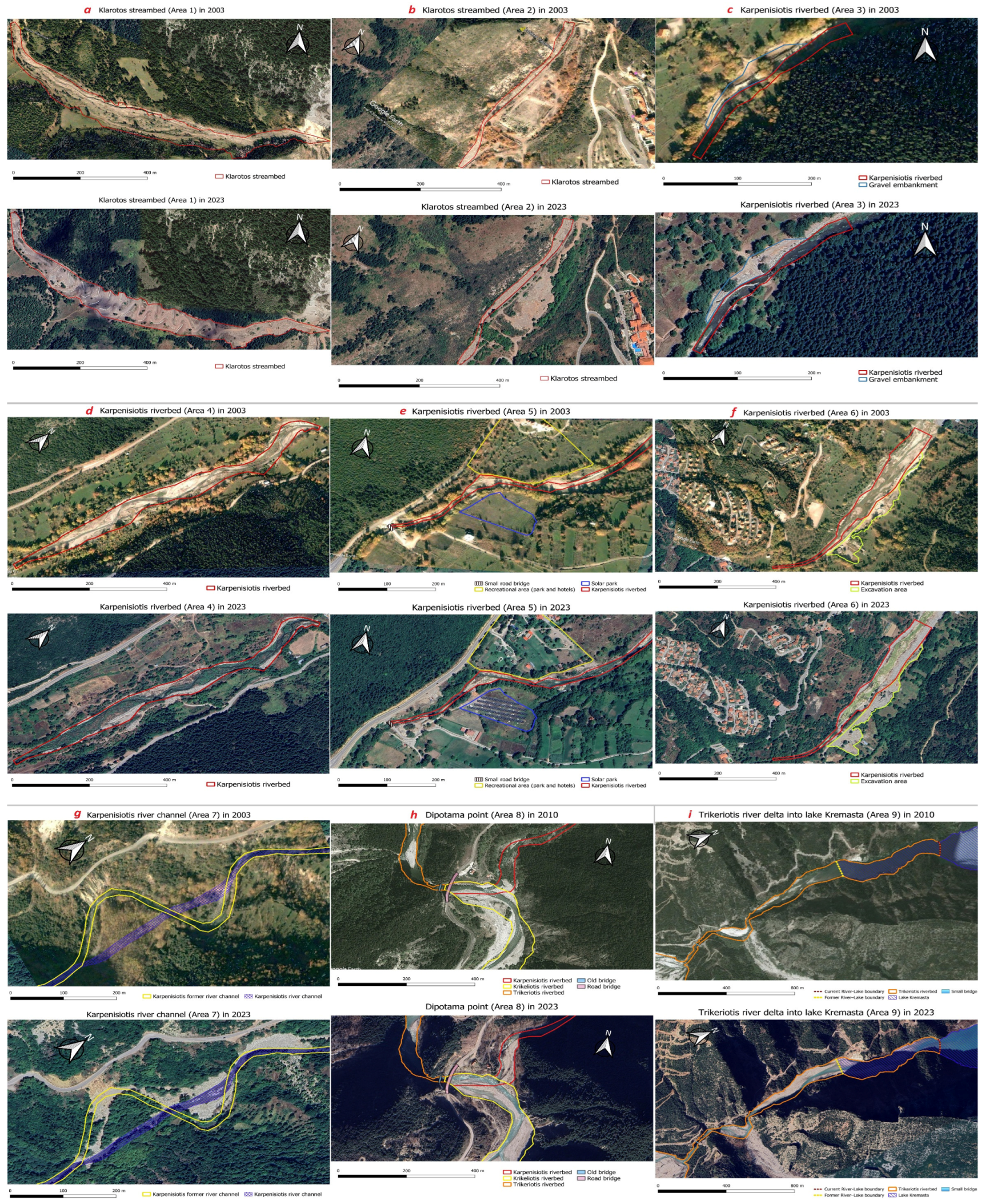 - Koutalakis, P.; Tzoraki, O.; Zaimes, G.N. Detecting riverbank changes with remote sensing tools. Case study: Aggitis River in Greece. Ann. Dunarea Jos Univ. Galati Fascicle II Math. Phys. Theor. Mech. 2019, 42, 134–142. [Google Scholar] [CrossRef]