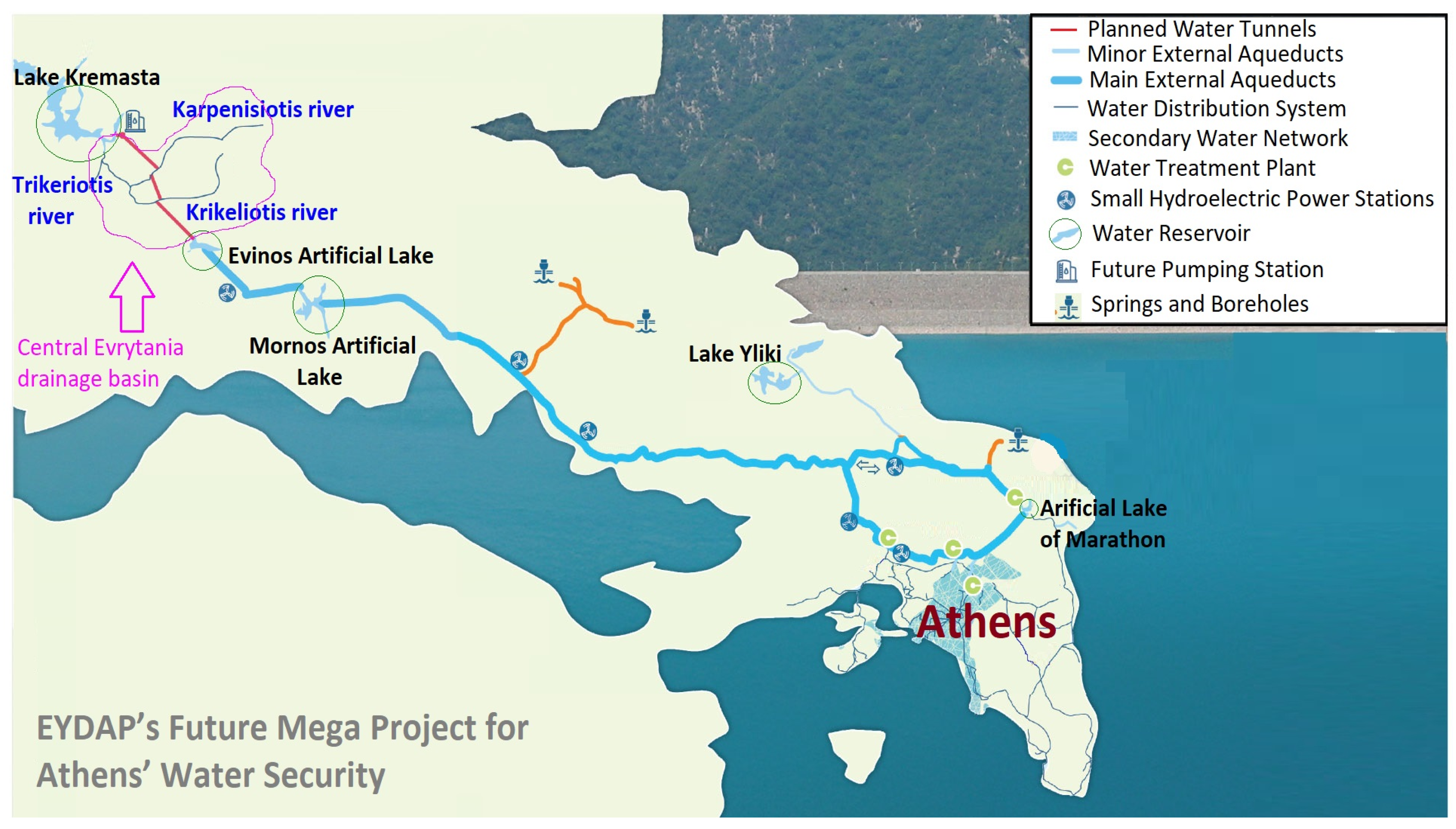 - European Committee for Water Resources Management Greek Section, ECWRMGS. Perspectives for the Solution of theAthens Water Supply Problem; ECWRMGS: Athens, Greece, 1990. [Google Scholar]