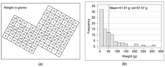 Example grid: (a) excavation grid with cells containing the weight values of finds in grams; (b) histogram of the data value distribution.