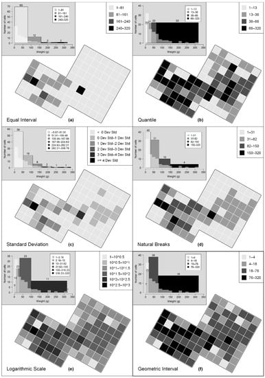 Classifications based on equal intervals tend to obscure spatial patterning because the lowest values (being the majority) are lumped into a single class with a wide range: 1–81 g. The subdivision appears to be slightly better when using the standard deviation and natural breaks schemes, although the values that are lower than 82 g (= the first class of equal interval), amounting to 82% of values, are concentrated in two classes: 1–51 and 51–109 g for standard deviation and 1–31 and 31–82 g for natural breaks.