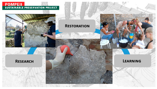 The Pompeii Sustainable Preservation Project (PSPP) is an international project entirely based on fundraising and direct financing by private investors, which, operating within the extraordinary context of the necropolis of Porta Nocera in Pompeii, aims to research and experiment with methodologies, techniques and materials for the conservation and restoration of ancient monuments, combining research, heritage conservation and education [4,5].