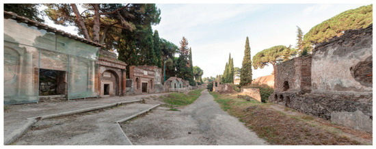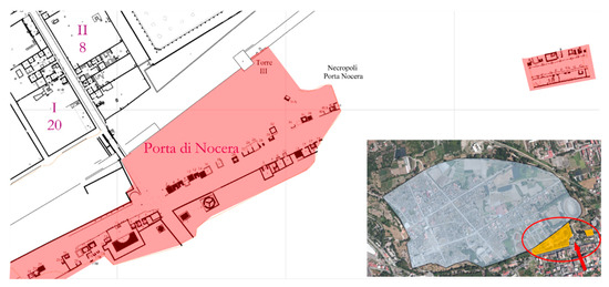 The necropolis of Porta Nocera and the nearby area of Via Nucerina constitute a single funerary site, in addition to the five necropolises identified outside the city walls by the excavations conducted in Pompeii until now [9]. The two sectors, located in the south-eastern area of the ancient city of Pompeii, were originally part of a single complex, alongside the extra-urban road leading from Porta Nocera to the town of the same name. Today, the two portions of the necropolis are separated by the current forecourt of the amphitheatre (Figure 2).