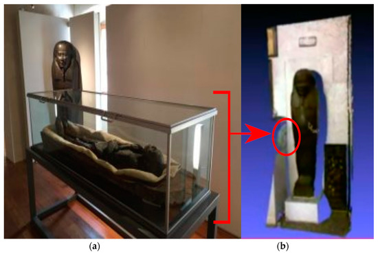 On the right (a), the Egyptian sarcophagus and the mummy within the showcase during the exhibition “Imago Animi. Volti dal passato” [11]; on the left (b), the 3D scene recorded during the Taung Project at the Anthropological Museum of Padua (the red circle underlines a transparent surface).