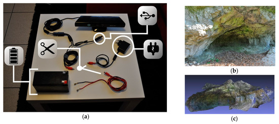 A hacked Kinect (a); a natural cave with a direct sunlight spot (b); a 3D real-time model of the same cave, without the illuminated area (c).