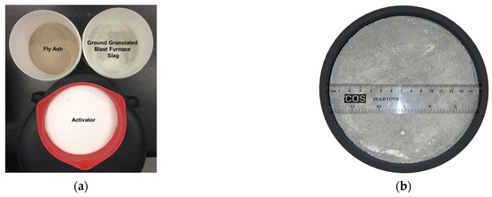 A reference geopolymer mix (G-FA) and the respective samples for the in-lab characterization were prepared starting from a geopolymer composition (Figure 1). The composition consisted of: (i) aluminosilicate raw materials derived from waste resources (e.g., fly ash and blast furnace slag); (ii) alkaline activators, such as alkali metal silicates (Na2SiO3); (iii) sand; and (iv) water (proportions shown in Table 1). For this geopolymer composition, the waste materials undergo reactions with the alkaline activators leading to the geopolymer gel formation during the mixing and curing at room temperature [8].