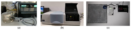 In-lab characterization: (a) Hot disk TPS1500 for thermal testing; (b) UV-Vis-NIR spectrophotometer with integrating spheres for solar reflectivity testing; and (c) AE1 RD1 D&D portable emissometer for thermal emittance testing.
