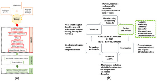 Figure 1 shows the framework of the research background associated with the present study (a) and summarizes the concept of CE applied to the built environment (b).