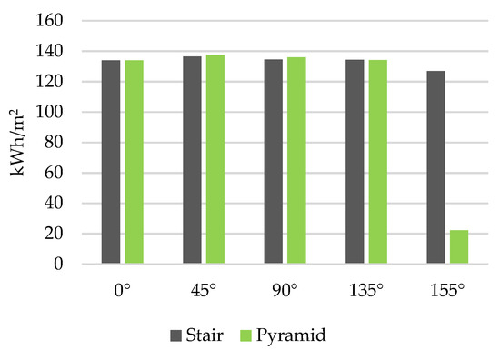 It is apparent that the 90° orientation receives more of the available daylight due to high exposure. Although this provides adequate light during the day and cuts down on energy that is consumed for artificial lighting, it also results in increased solar heat ingress that raises the space cooling requirement during the warm season in Shiraz. It can be further deduced that the orientations of 45° and 135° provide a balance between daylighting and thermal shading by the placement of the blocks, while the 155° models experience overshadowing, leading to daylighting below the acceptable requirements [12]. The results of the shadowing analysis show that the scenarios with orientations of 0° and 90° present less shadow at their sites for both the stair and pyramid typologies compared to the other orientation scenarios.