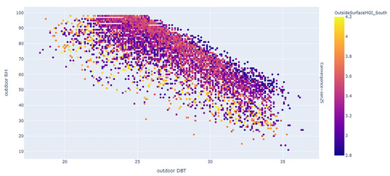 Figure 1 suggests that an MGI of 4 to 6 can be expected on the AAC wall assembly when the surface temperature and surface relative humidity are in the range of 25–30 °C and 60–100% RH, respectively. Additionally, it was also observed that the MGI tends to be in the range of 3 to 4 when outdoor DBT and outdoor RH are in the range of 20–30 °C and 60–100% RH, respectively.