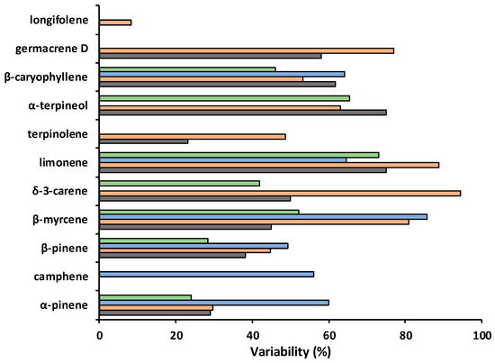 Variability in the amounts of volatile compounds present in P. brutia EO was determined as the range of value percentage of the maximum value in the plant parts where more than one sample was reported (namely needles, twigs, resin or cones). Apart from longifolene, all compounds showed at least 20% variability between samples (Figure 2). The highest variabilities (≥80%) were detected for δ-3-carene (94%) and limonene (89%) in twig EOs, and β-myrcene in EOs from resin (86%) and twigs (81%).