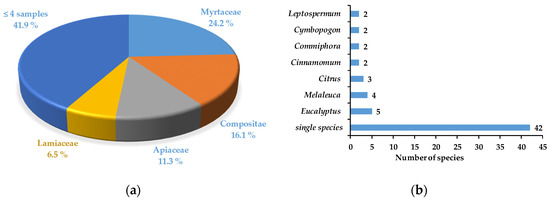 Plant sources of the essential oils tested against Fusarium circinatum, compiled according to (a) family (% of samples) and (b) genus (number of reported species).