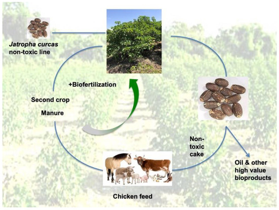 Jatropha curcas (physic nut) is a promising crop in tropical countries because its seeds have a high oil content that can be easily transformed into biodiesel. The oil can also serve to obtain other bioproducts. However, several obstacles hinder the extensive application of the crop, for example, the relative low prices of petroleum and oil, the toxicity of the seeds, low crop yields and rusticity of the plant. We propose a model in which several biotechnological strategies are applied to increase the crop value of Jatropha, while maintaining the fertility characteristics of the soil, and reducing its carbon and water footprints.