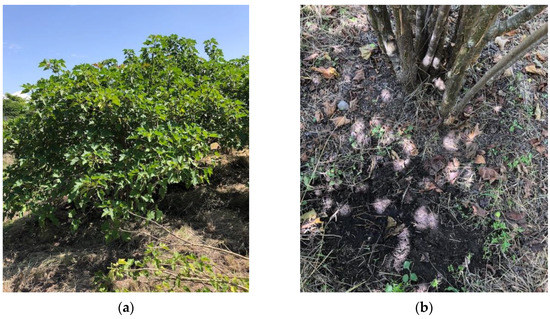 The parcel covers about 1 ha with 800 plants, in 40 rows of 20 plants each, direction North–South. The non-toxic Jatropha plants are 5 years old, healthy, of about 2.5 m height. In the West limit of the parcel, the soil changes visibly to being sandier and the plants are smaller, possibly due to reduced nutrients (Figure 3a). The plots contain 10 plants each. In this part of the field, five treatments with two random-generated repetitions were applied (10 plots). The treatments were as follows: