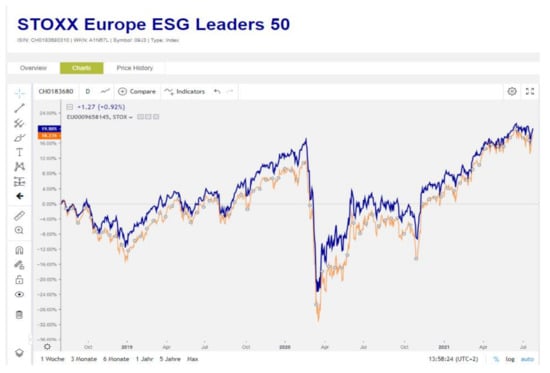 For our analysis, we used the STOXX Europe ESG Leaders 50 index (https://www.boerse-frankfurt.de/sustainabilities/indices (accessed date: 30 July 2021)). This index includes companies that are global leaders in terms of ESG criteria, based on indicators measured by Sustainalytics (Sustainalytics is a company that provides high-quality, analytical environmental, social and governance (ESG) research, ratings and data to institutional investors and companies), with presence in 17 European countries: Austria, Belgium, Denmark, Finland, France, Germany, Ireland, Italy, Luxembourg, the Netherlands, Norway, Portugal, Spain, Sweden, Switzerland and the United Kingdom.