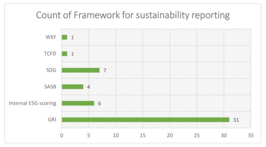 Most corporations use well-established and known ESG monitoring and reporting frameworks, such as the Global Reporting Initiative (GRI) (the Global Reporting Initiative (GRI) is a non-profit worldwide standards group that assists corporations, governments and other organizations in understanding and communicating their impacts on topics such as climate change, human rights and corruption (website: https://www.globalreporting.org/ (accessed date: 30 July 2021)), the Sustainability Accounting Standards Board (SASB) (the SASB is a non-profit organization dedicated to the creation of sustainable accounting standards; investors, lenders, insurers and other financial capital providers are becoming more aware of the influence of environmental, social and governance (ESG) issues on company financial performance, prompting the demand for standardized reporting of ESG data (website: https://www.sasb.org/ (accessed date: 30 July 2021)), the Task Force on Climate-related Financial Disclosures (TCFD) (the Task Force on Climate-related Financial Disclosures (TCFD) was established by the Financial Stability Board to enhance and expand reporting of climate-related financial information (website: https://www.fsb-tcfd.org/ (accessed date: 30 July 2021)) and the World Economic Forum’s (WEF) indicators (Figure 2) (‘Measuring Stakeholder Capitalism: Towards Common Metrics and Consistent Reporting of Sustainable Value Creation’ (available at: http://www3.weforum.org/docs/WEF_IBC_ESG_Metrics_Discussion_Paper.pdf (accessed date: 30 July 2021)), and all of these frameworks are consistent with the 17 SDGs. Six out of the 50 organizations under consideration use internal resources to develop a customized framework for ESG reporting, whereas seven of them monitor their non-financial performance by using the SDGs as a benchmark.