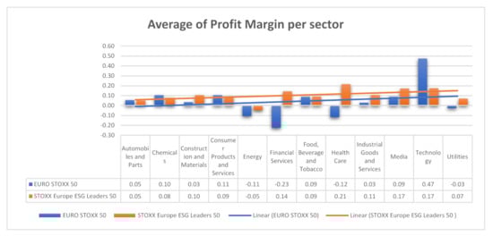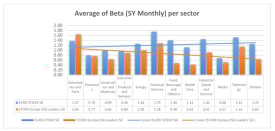 Four sectors, namely Personal Care, Drug and Grocery Stores, Real Estate, Retail and Telecommunications, have no representatives in the EURO STOXX 50 Index, whereas the Travel and Leisure sector has no representative in the STOXX Europe ESG Leaders 50 index. For our results to be comparable, therefore, we excluded those sectors from our analysis. We considered this intervention to have not harmed our conclusions, as they concern only 10 firms out of a sample of 69.