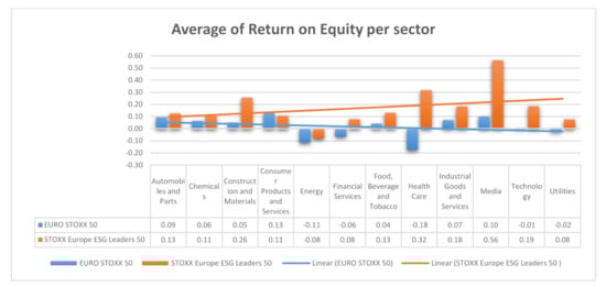 Our analysis showed, as with ROA, that companies with good ESG performance have a better return on equity than the others (Figure 6). Even in the sectors with negative returns, such as the energy sector, ESG leaders demonstrate less negative return on equity than the others. Our findings on the relationship between both ROA and ROE are in line with the work of De Lucia [6], which concludes, using machine learning techniques, that a firm’s financial performance improves as a result of good ESG.