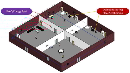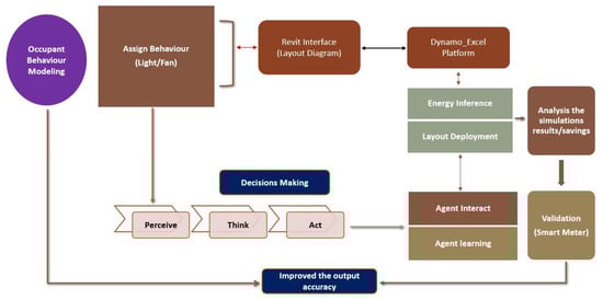 Usually, an occupant agent observes its surroundings, which is well-described by the input data and the space layout information as well as thermal and visual situations of the specified spaces. The layout conditions (Figure 2) correspond to the individual’s agent’s destination (e.g., seating point) and other parameters (e.g., switch distance) that allow an occupant agent to realize its motivation to keep track of the energy calculation. The goal of the energy estimation is to describe how agent (occupant) behaviours influence the interior of allocation within the space. This can expressively influence the occupant’s destination; switch distances and environmental conditions that also consider the behavioural variations made by occupant agents. The last part of the framework is intervention and model validation, which determine the flexibility and robustness of the proposed model.