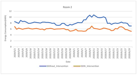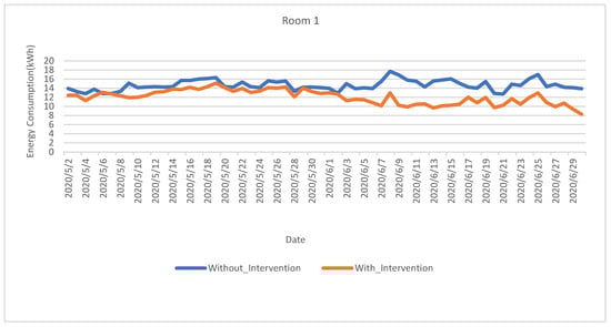 Using the developed ABM model, several simulations were executed. The simulation outcomes were calculated in one-minute interval. The following figures (Figure 3 and Figure 4) show the simulation outcomes for two individual rooms (similar size, dimension, and indoor allocation) of a residential building. This includes individual energy consumption patterns without and with intervention for a group of occupants. The simulated results indicate a considerable amount of building energy savings while using a sustainable space layout configuration. However, the energy consumption pattern and potential savings for similar rooms were different. It may connect to the occupant’s number related to metabolic gains from the human body as well as indoor and outdoor environmental conditions []. In general, during the summer season, the outdoor solar radiation and temperature are above average, as well as heat gains from the building envelope are also high [,].