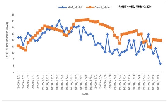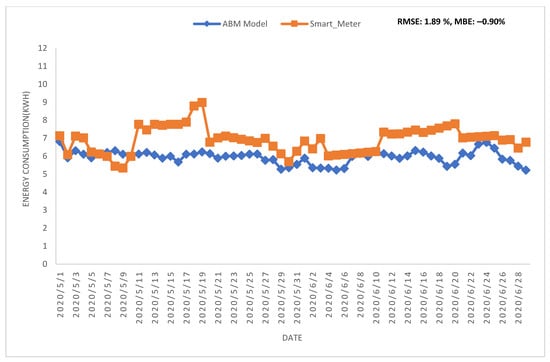 Typically, a validation approach is required for the simulated model to check its robustness and feasibility. The purpose of this approach is to compare the energy consumption data obtained from the real occupied building. Typically, real energy data are empirical, commonly called “true” data; it is recommended as a powerful validation tool because it can be manipulated to evaluate the reviewing data []. In this regard, simulated energy consumption data were further validated using the real data obtained from the smart meter (Figure 5).