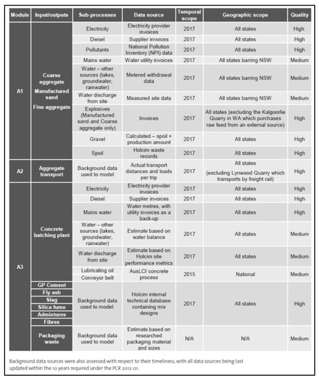 The allocation approach of the AusLCI LCA database was adopted as a default for secondary data and processes (e.g., secondary fuel in cement production). The AusLCIdataset conforms to EN 15804 when applying allocation to its various processes and sub-processes. Data quality for the foreground data was assessed in terms of geographic and temporal representativeness is shown in Figure 1. All data sources were scored at medium or higher.