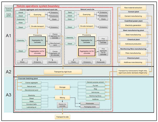 Allocation was necessary to proportion inputs and outputs to intermediate flows at the quarry and processes at the batching plant level. As much as possible, intermediate flows were allocated physically based on weight (quarries) or based on m3 of concrete (at the batching plant). At the quarry level, whenever physical allocation was not possible, economic allocation was carried out based on Holcim’s internal cost system.