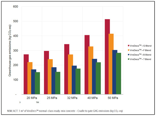 Cradle to gate GHG emissions (kg CO2-eq) for 1 m3 of ViroDecsTM normal-class ready-mix concrete in NSW and ACT. Blend categories: G—General Portland cement mix (no SCM), F—fly ash included, B—ground granulated blast furnace slag included, T—triple blend (includes slag & fly ash).