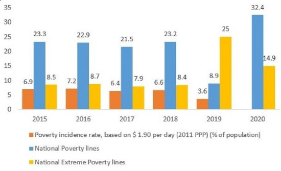 Generally, poverty is considered a social phenomenon caused by a lack of resources. Internationally, a person is poor by income when he lives with less than 1.90 USD per day, known as the poverty line. At the National level, the poverty line of 2020 is at 84.1 USD per month. The extreme poverty line is at 47.4 USD per month [11]. The data so far (see Figure 1) indicates that poverty increased by 3.5 percentage points and extreme poverty by 1 percentage point from 2017 to 2019.