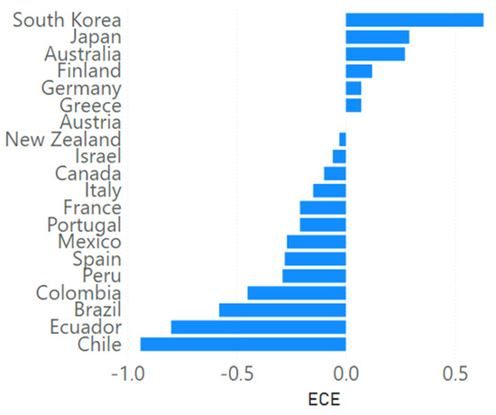 The ECE value, when positive, indicates effective control of the pandemic; when negative, the management is inefficient in control and mobility exceeds the reduction in ERR. In both cases, the value obtained for Ecuador was < 0, and, hence, was ineffective in the time frame analyzed. Furthermore, other countries faced the pandemic differently. The rapid widespread testing, diagnosis, tracing and monitoring by South Korea places it first in the ECE country chart (Figure 3). ECE values for OECD countries were taken from the 2020 Sustainable Development Report [6]. As for Brazil, Mexico, Peru, Colombia and Chile, some estimations were made following the same methodology employed for Ecuador and based on several academic publications from each country [7,10,43,44].