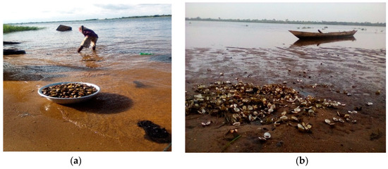 (a) Freshly harvested oysters ready for head-carriage to a local market. (b) A scene of dead oysters washed offshore observed through a rapid action on an early morning at 7:45 a.m. (GMT) at Agorta Bay, near Soga City in the Lower Volta Basin.