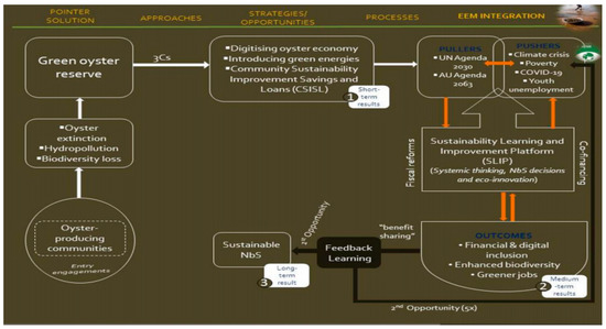 Thus, in connecting eco-entrepreneurial decisions through SNbS to sustainably conserve oysters within the larger coastal landscapes, the financial, social and environmental modes for turning around system change towards sustainability must be equally prioritised. GEEM illuminates this character by redefining and promoting sustainable finance of climate solutions, SDGs and ensuring consistent flows of financial and ecosystem services. While further investigation into how GEEM-SNbS can lead to long-term sustainable change and the sustainability of large-scale SNbS is strongly recommended, this model is relevant for incentivising and galvanising international public–private partnerships and sustainability actions from and for ELICs to catalyse socio-environmental transformation.
