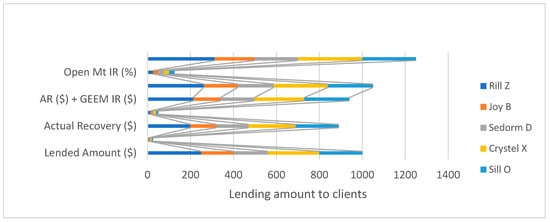 CSISL was tried on a microscale with US$ 1000 (Lended Amount—LA) that remarkably yielded 89.5% Actual Recovery (AR) success within an agreed 180 days at GEEM Interest Rate (GEEM IR) of 5% (see Figure 3) as compared to an Open Market Interest Rate (Open Mt IR) of over 25% in the first half of 2021. Once sustainability has improved, it is expected that the 5% interest rate will further reduce [43], thereby, enabling more people, predominately vulnerable women to emerge out of SDGs #1 and #2. The remaining 9.5% of the loan was retrieved after 6 months.