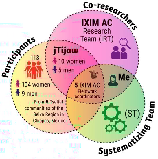Figure 1. Participants and co-researchers. - The systematizing team (ST): composed of six people including the five IXIM AC fieldwork coordinators and the author of this paper as lead co-researcher. The five IXIM AC fieldwork coordinators are considered participants of this study because their perspectives and experiences working with the jTijaw and their groups in the six Tseltal communities were considered as part of the data. However, they also collaborated in the gathering, cultural and language translation, coding, and analysis of the data using traditional orally based methods following the IGT methodology [,].