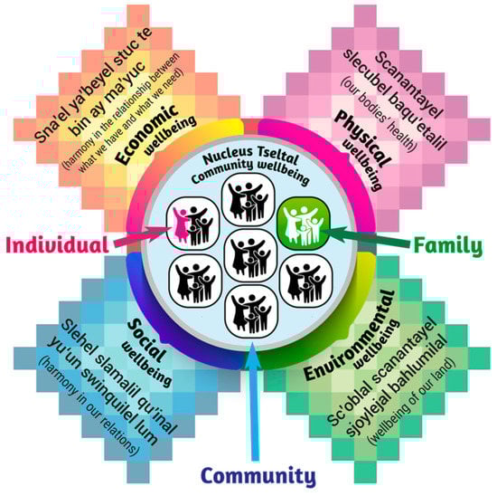 The co-creators/participants of this research perceive that for Tseltal community wellbeing or buhts’an qu’inal to exist, it is essential to attend to the holistic, all-encompassing wellbeing of all the community’s individuals. Each Tseltal individual’s wellbeing transcends to the wellbeing of their families that create and generate their sense of community. The participants/collaborators of this study identify this three-dimensional interconnection between the individual–family–community as the Nucleus of Tseltal community wellbeing, which is at the center of what the participants/collaborators call the four building elements of buhts’an qu’inal (Figure 2).