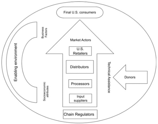 The export value chain model that we used was inspired by the market value chain approach implemented in the USAID report for Kenyan specialty Coffee in Bangladesh [6]. There are many important interactions assumptions that make up the Ramón supply chain and that contribute to the functioning of the whole operation. The enabling environment that we refer to in Figure 1 involves the existence of socioeconomic attributes and business factors that enable this whole operation to exist. It is important to mention that, since the beginning of the operation, the Ramón chain has as its ultimate objective the conservation of the environment and the promotion of better livelihoods for the population that lives in the concessions of the Mayan Biosphere. The social factors are equivalent to the existing social mobilization around the Ramón-associated economic activity, the improvement of the quality of life of the community, and the constant preservation of the environment through the execution of management plans and audits to maintain the concessions.