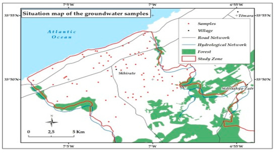 Groundwater is the main source of drinking, agricultural, and industrial water. The increase in the exploitation of groundwater and increasingly unfavorable climatic conditions (especially the rainfall variability) have led to the reduction of the aquifer reserves and deteriorate groundwater quality [2]. These pose a danger to the sustainability of the land-use system. The most notable degradation process is the salinization of groundwater [3]. Therefore, the aim of this study was to identify the problem of water salinity, identify areas at risk, and find solutions for the management of these resources. This study consists of mapping and analyzing the quality of groundwater used for irrigation in the coastal region of Skhirat, Morocco, which is one of the most important market gardening areas in the Rabat-Salé region. This study assesses the degree of degradation and provides support for developing decision-making tools.