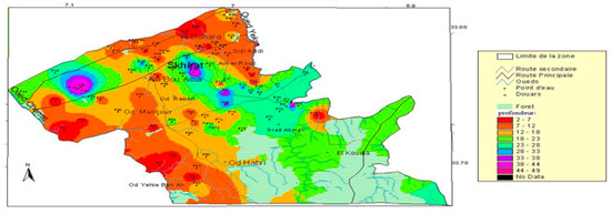 The bathymetric map shows that the depth of the water table oscillates between 2 and 45 m with an average of 16.5 m. The aquifer is closer to the surface in the downstream areas of the region, and to the South-West; this is due to the infiltration of water from the rivers and the sea. At the central and South-East parts, the aquifer is deeper, reaching 45 m (Figure 2).