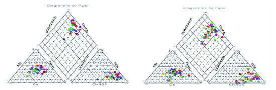 The representation of the chemical results of the waters on the Piper diagram (Figure 3) made it possible to distinguish two types of facies that characterize the waters of Skhirat (sodium chloride facies in particular in the downstream and central zones and calcium chloride facies in the upstream zone).