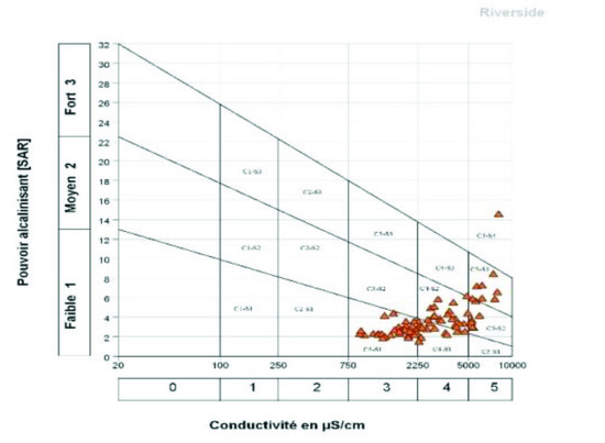 The classification of waters, according to the American classification diagram proposed by USSL Riverside (Richards, 1954) (Figure 4), shows that the dominant classes are C3-S1 and C4-S2 (Table 1). These waters are very strongly to extremely saline and therefore have a very strong salinizing power on the soil (which can cause a reduction in the yields of sensitive crops). A total of 80% of the irrigation waters have a SAR of less than 8, and therefore these waters present a relatively low risk of alkalinization.