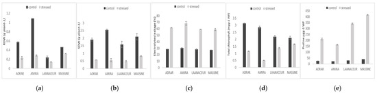 Effect of 300 mM NaCl treatment on RDW (a) SDW (b) EL% (c) chlorophyll content (d) and proline content (e) in four barley Moroccan varieties. Values indicate the means of three replicates. Treatment was applied during ten days.