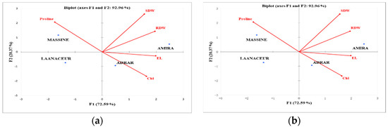 Principal component analysis (PCA) was used as a preferment multivariate statistical tool to discriminate between treatments and varieties based on two top first factors (F1 and F2). In control, F1 and F2 accounted, respectively, 72.59% and 20.37%, our biplot (Figure 2a) discriminates AMIRA in the positive side of F1 with high values of SDW, RDW, and EL%. The negative side of F1 shows MASSINE with high value of proline content. On the other hand, F1 and F2 accounted, respectively, 63.38% and 34.23% under salt stress, the biplot created in this case (Figure 2b) discriminates MASSINE with high levels of proline and Chl T contents, and SDW, and RDW in the positive side of F1 and F2. The negative side of F1 shows AMIRA with high score of EL%. Under salt stress, PCA shows MASSINE variety with high values of tolerance indexes (SDW, RDW, and Chl and Proline contents). However, AMIRA is linked with sensitivity marker (EL%).