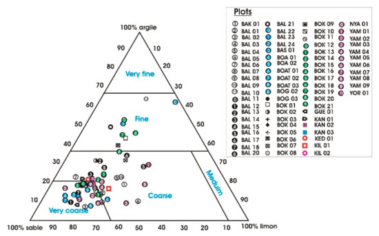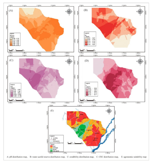 Results showed that the Bokito soils range from sandy loam to sandy clay loam (Figure 2), which is dominated by coarse material (Figure 3). The yellow ferrallitic soils are moderately acidic (Figure 4A) with a good useful water reserve (Figure 4B). The CEC is maximum (Figure 4C) and the erodibility rate is high (Figure 4D). These soils have a very good agronomic suitability (Figure 4E).
