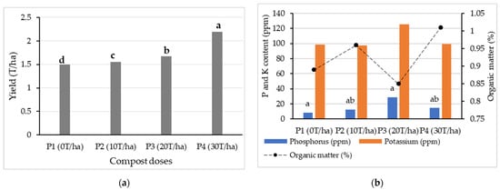 Impact of compost amendment on Stevia yield (a) and soil fertility (b). The average values given by the same letters are not significantly different in ANOVA and the Tukey test (p < 0.05). Lowercase letters (a, b, c and d) indicate significant differences between treatments.