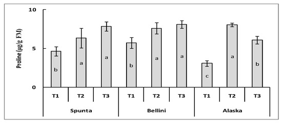 The proline content in the Alaska leaves was set in the following decreasing trend T2 > T3 > T1 (Figure 1). However, there is no significant difference between T2 and T3 in Spunta and Bellini.