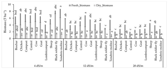 Variation in final fresh and dry biomass as response to irrigation-water salinity and organic amendments. Error bars indicate the standard deviation. a, b, c, and d present Tuckey’s test at p = 0.05.